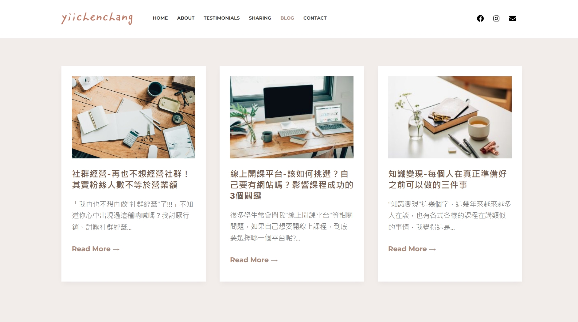 作品集 作品集 譯蓁老師 YIICHENCHANG 品牌課程開發顧問 View More 馬力的法國主婦生活 法國部落客 View More 安如設計 Anne Lu 軟裝師教練 / 室內設計師 View More 洋片 Mamachips 美感品牌力教練 / 手作設計師 View More 港灣藝術心理諮商所 Janice Lin 所長/諮商心理師/藝術治療師 View More